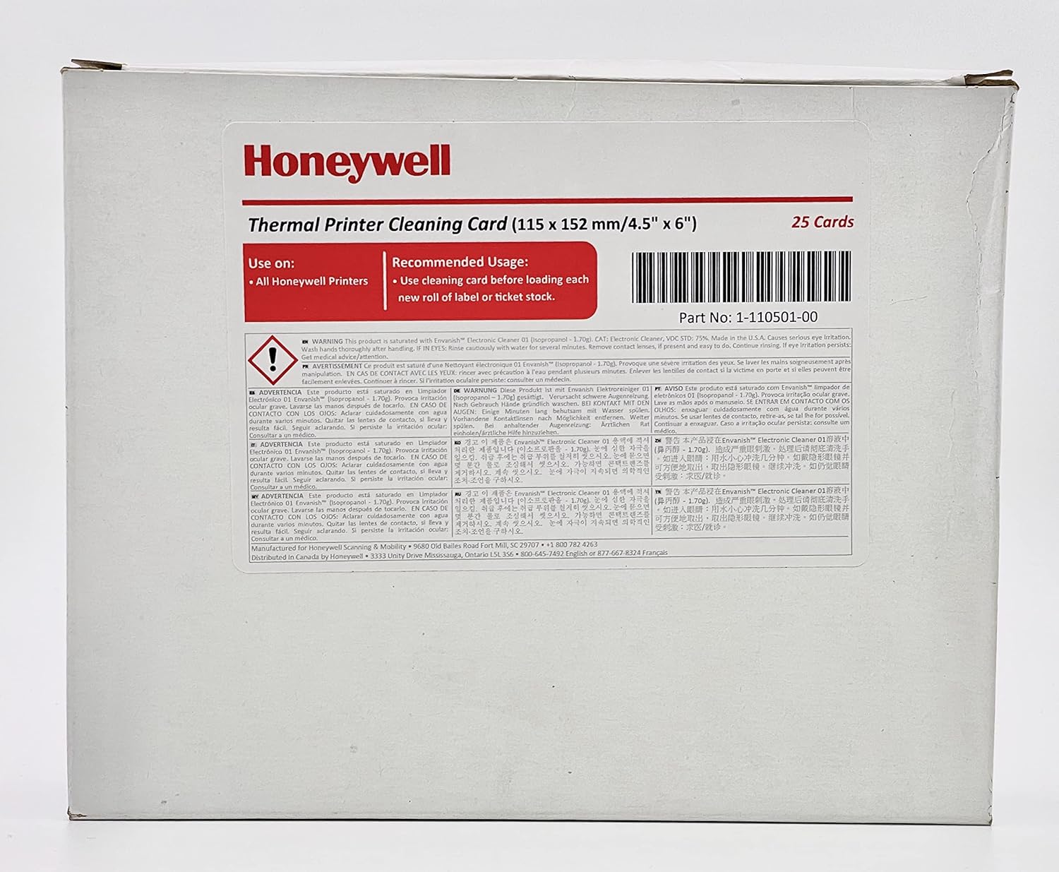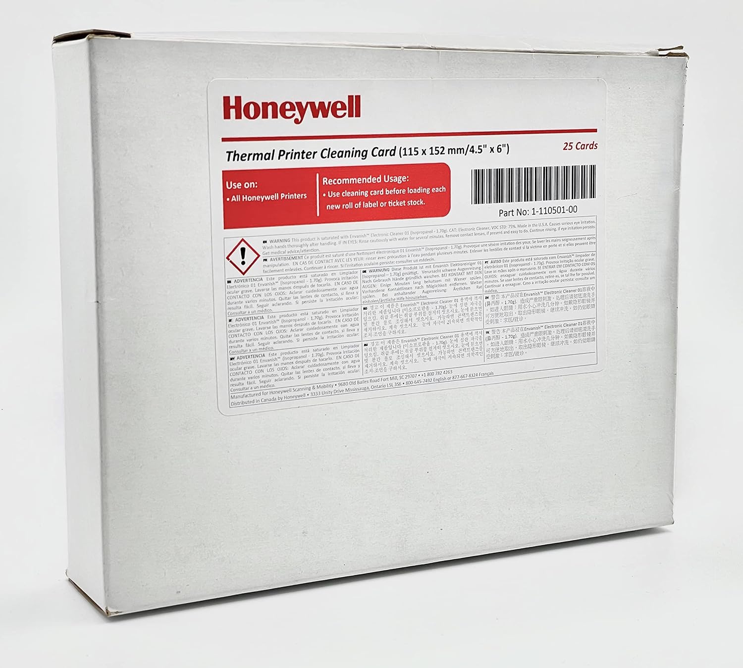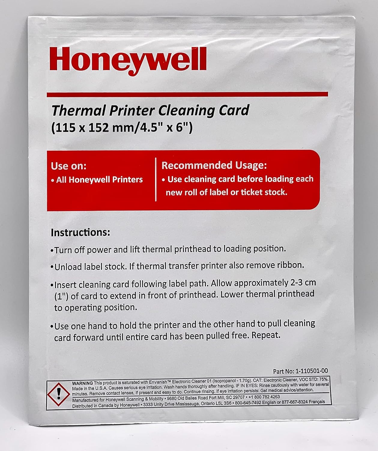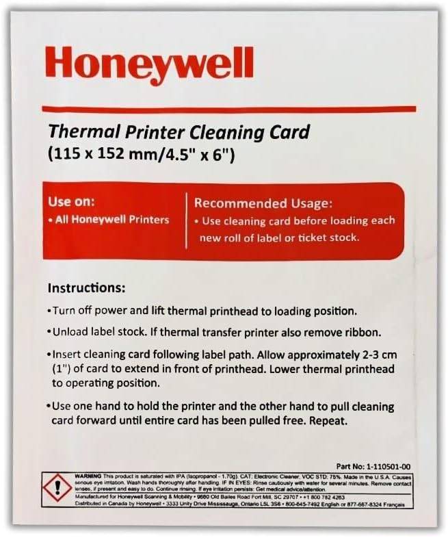TARJETA DE LIMPIEZA 115X152 HONEYWELL THERMAL PRINTER CLEANING CARD 1-110501-00