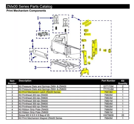 Zebra PRINTMECH LANTCH 79819M ZM400, Kit de pestillo de mecanismo de impresión ZM400, ZM600 para impresoras serie Zebra ZMx00